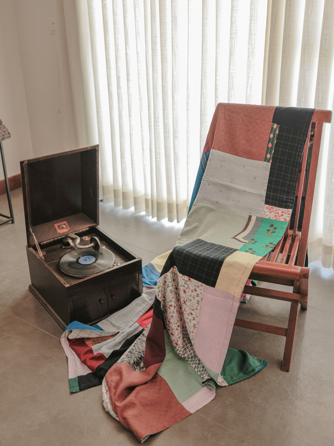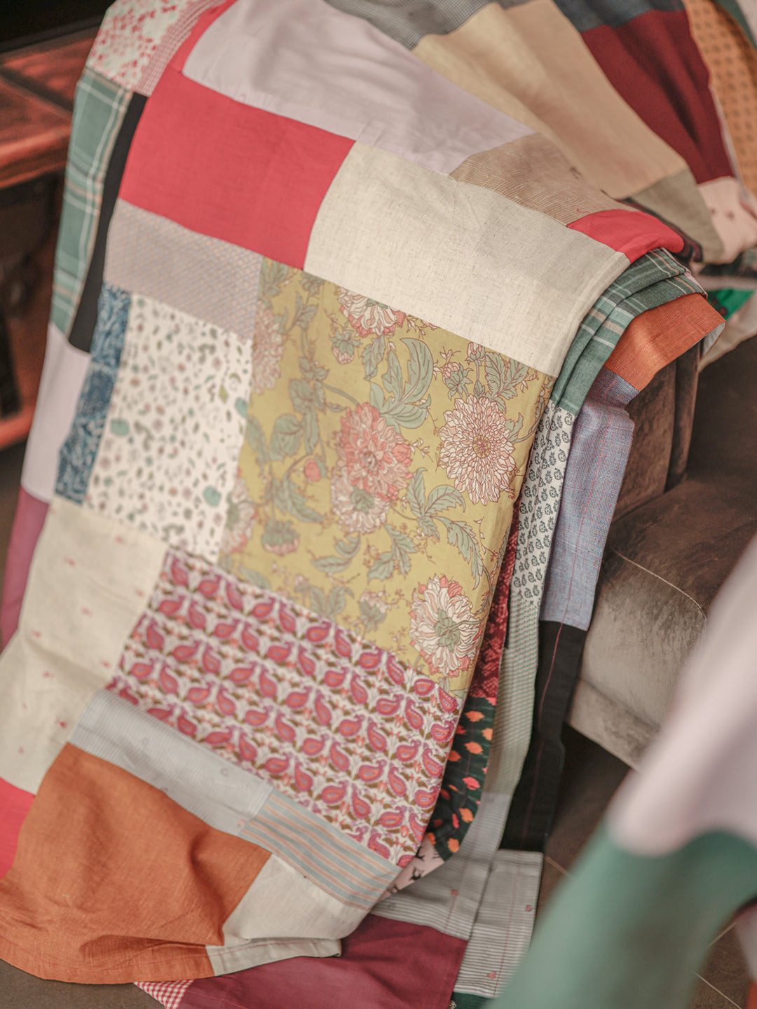 Handcrafted cotton reversible patchwork double blanket -  features vibrant colour blocks created from thoughtfully collected cotton fabric remnants gathered over three years. Each piece is individually cut and stitched, making every blanket unique. Lightweight, soft, and breathable. It can be used on both sides and is a timeless, eco-friendly addition to your home that celebrates craftsmanship, nostalgia, and conscious living.