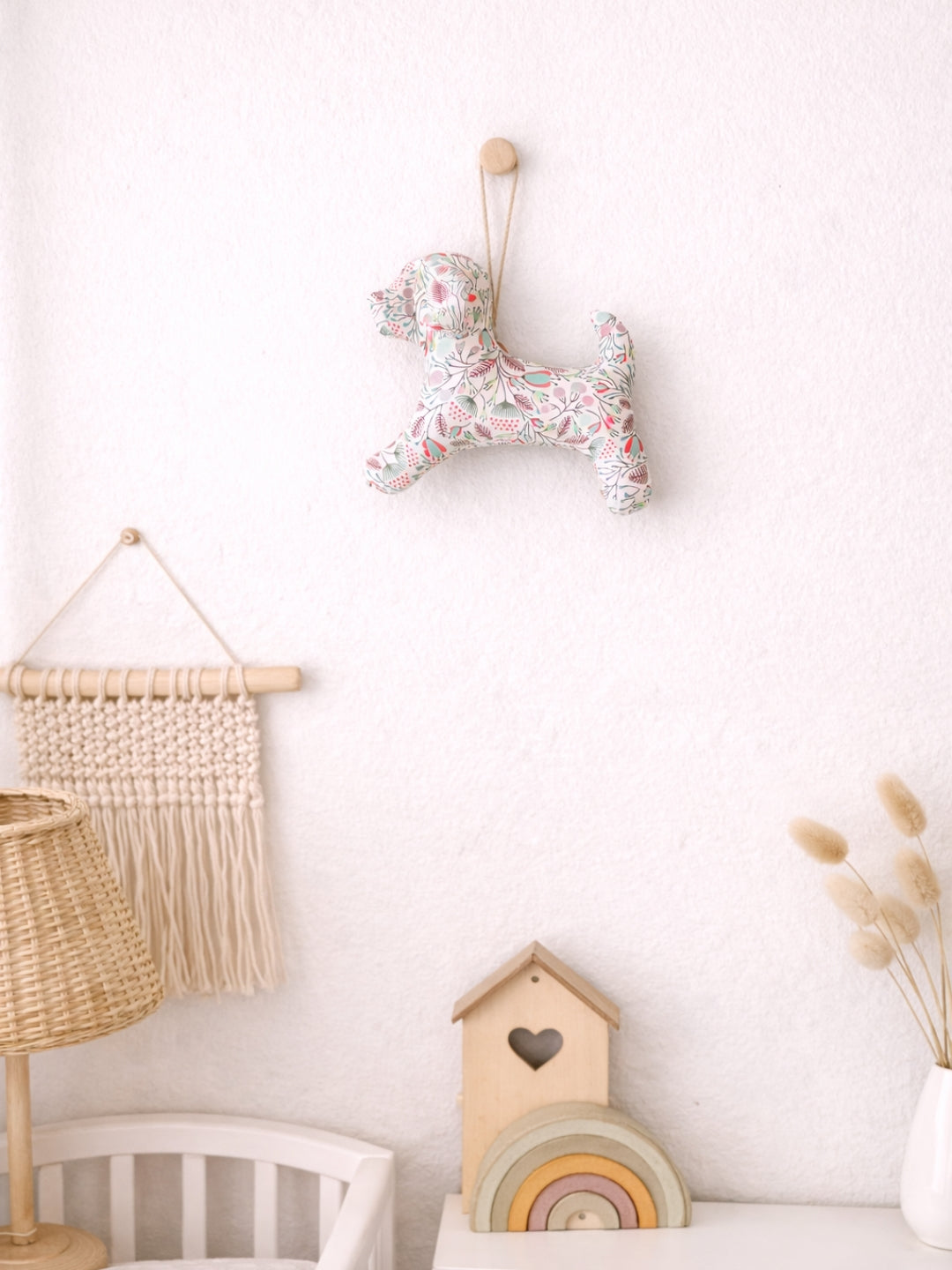 The Dog is a soft fabric décor accent made from surplus cotton, designed to bring gentle character to baby rooms through visual styling. It fits naturally on shelves and ledges.
