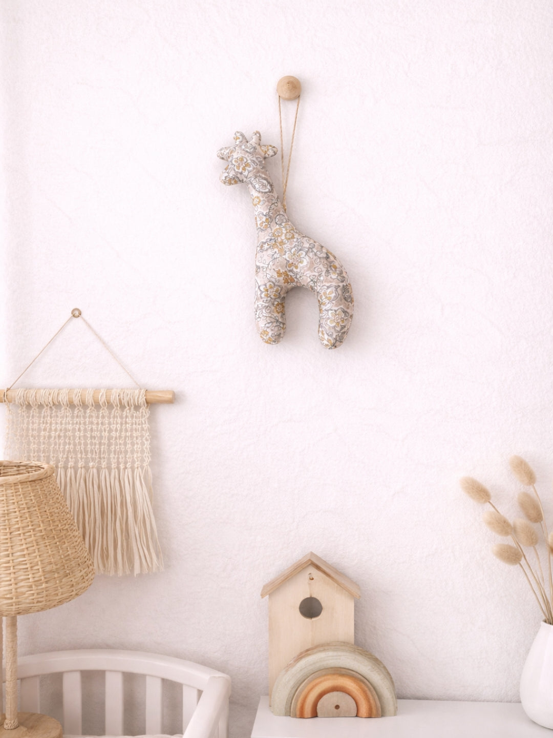 The Giraffe is a tall, soft fabric décor accent made from reclaimed cotton, designed to add height and softness to nursery interiors.